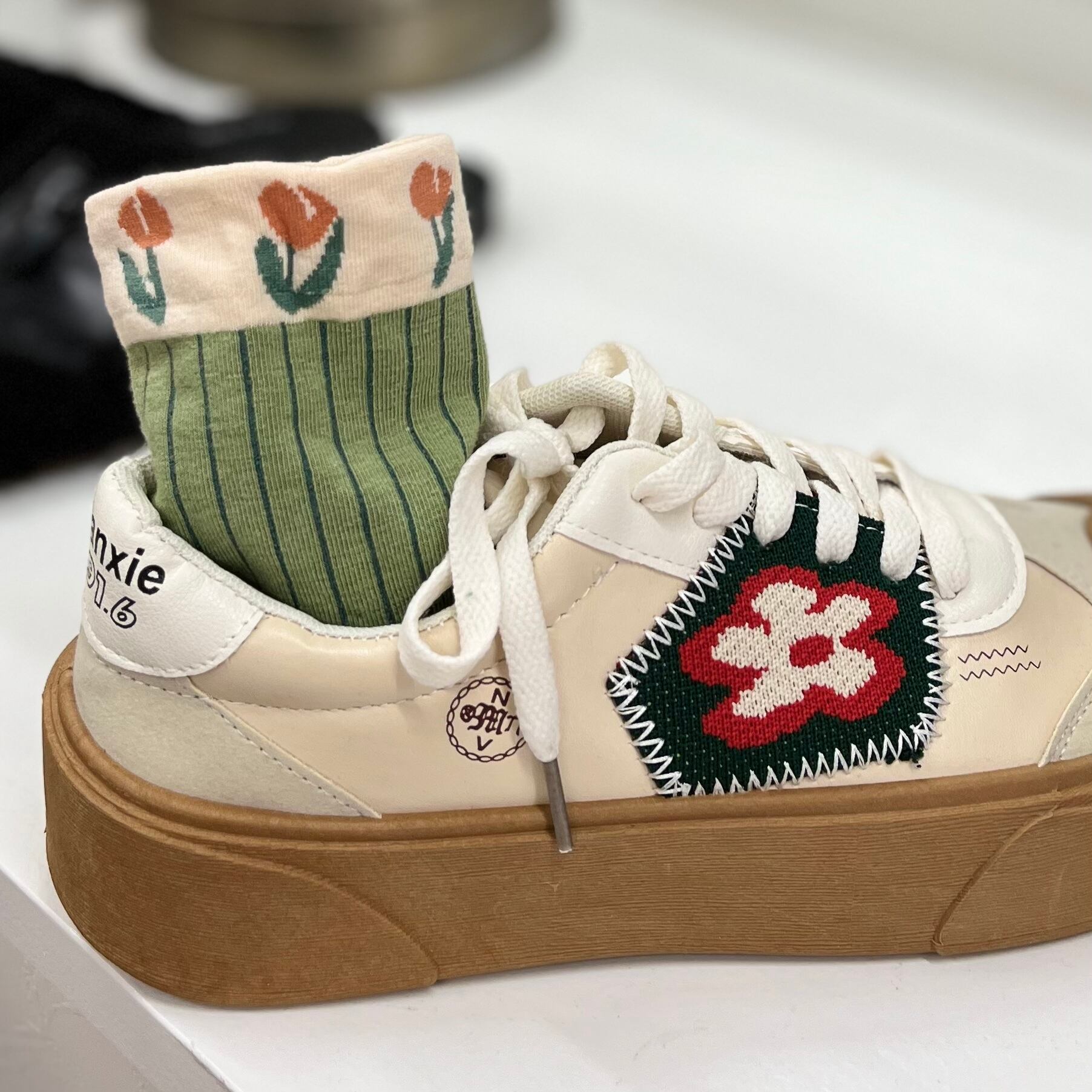 レトロコーデにとっても合うフラワーデザインのガーリーなソックス♡グリーンとイエローの組み合わせが春っぽいです♡