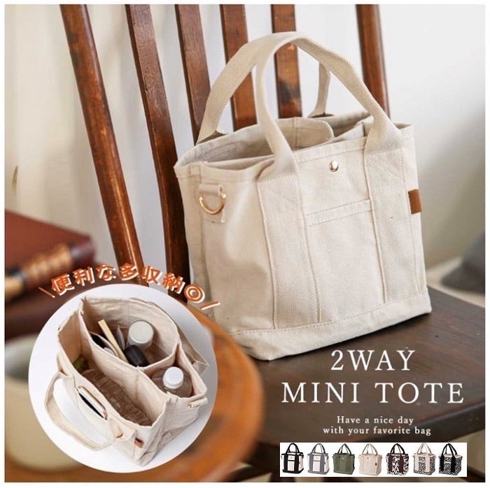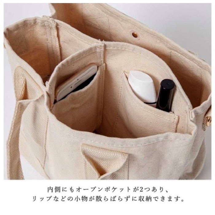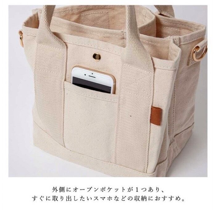 2way使用のミニトートバッグ。500mlのペットボトルが横にも縦にもすっぽり入るサイズです♩収納ポケットがたくさんあり小物も細かく収納できます。